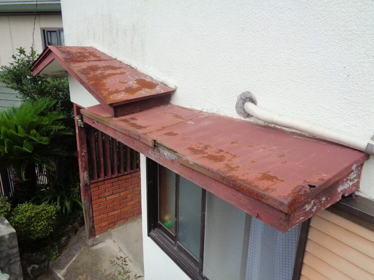 庇(ひさし)は、年数が経つとトタン部分のサビや、木部の剥がれなどが起こりやすい場所です。軽い劣化であれば塗装で保護できますが、サビの進行や剥がれが大きい場合は、板金工事でしっかり補修してから仕上げることが大切です。