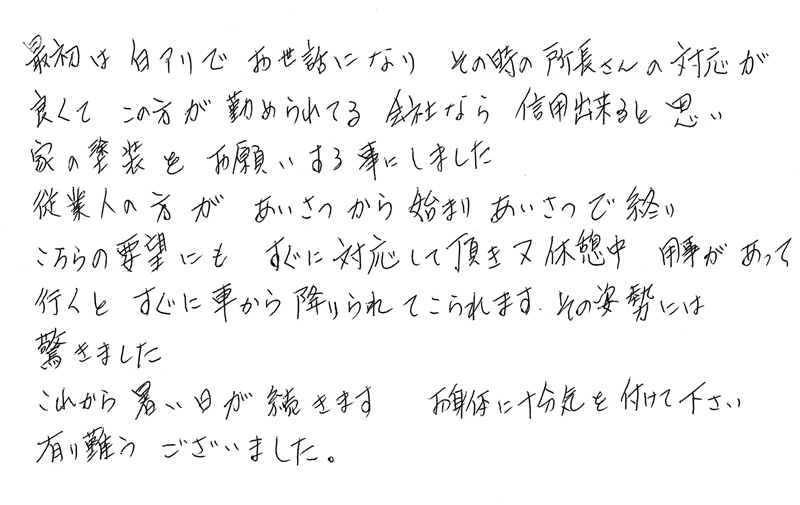 佐世保市 桑原様 2022年2月24日 最終更新日時 : 2025年12月4日 sanwagikenこの会社なら信用できると思いお願いする事にしました佐世保市 桑原様最初は白アリでお世話になり、その時の所長さんの対応が良くて、この方が勤められてる会社なら信用出来ると思い、家の塗装をお願いする事にしました。従業員の方が、あいさつから始まりあいさつで終わり、こちらの要望にもすぐに対応して頂き、又休憩中、用事があって行くとすぐに車から降りられてこられます。その姿勢には驚きました。これから暑い日が続きます。お身体には十分気を付けて下さい。有り難うございました。原文はこちら 一覧に戻る